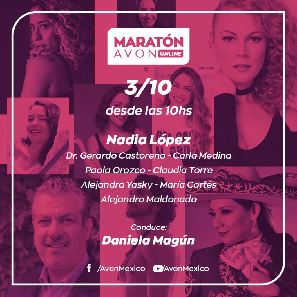 Las actividades comenzarán a las 10 hrs a través del Canal de YouTube de AVON y su Facebook @AvonMexico. La conducción estará a cargo de Daniela Magún, integrante de Kaba y amenizado por la música de Nadia, egresada de La Academia.