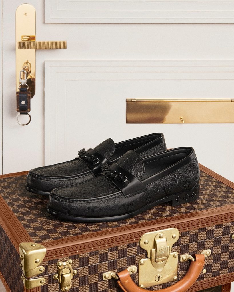El mocasín LV en piel de becerro graneada negra aporta un toque moderno a un estilo clásico con su patrón de monograma en relieve y adornos de cadena, una firma de las colecciones de accesorios de Virgil Abloh para Louis Vuitton. Tres flores de monograma están incrustadas en el talón, mientras que la suela de cuero tiene un inserto de goma para mejorar la resistencia al deslizamiento.